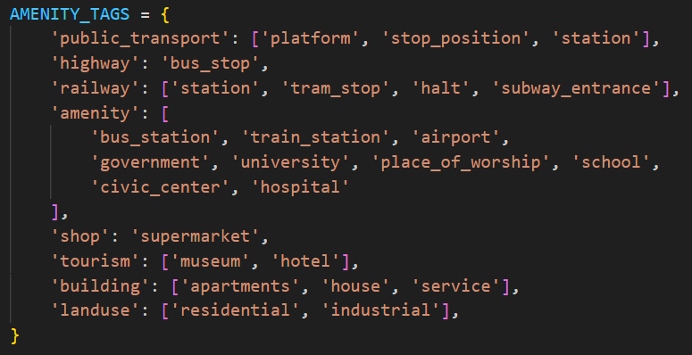 - We excluded certain amenities at our own discretion, such as 'shed', 'guardhouse', 'ferry_terminal', 'garages', and 'bridge' (labels as they appear on OpenStreetMap).