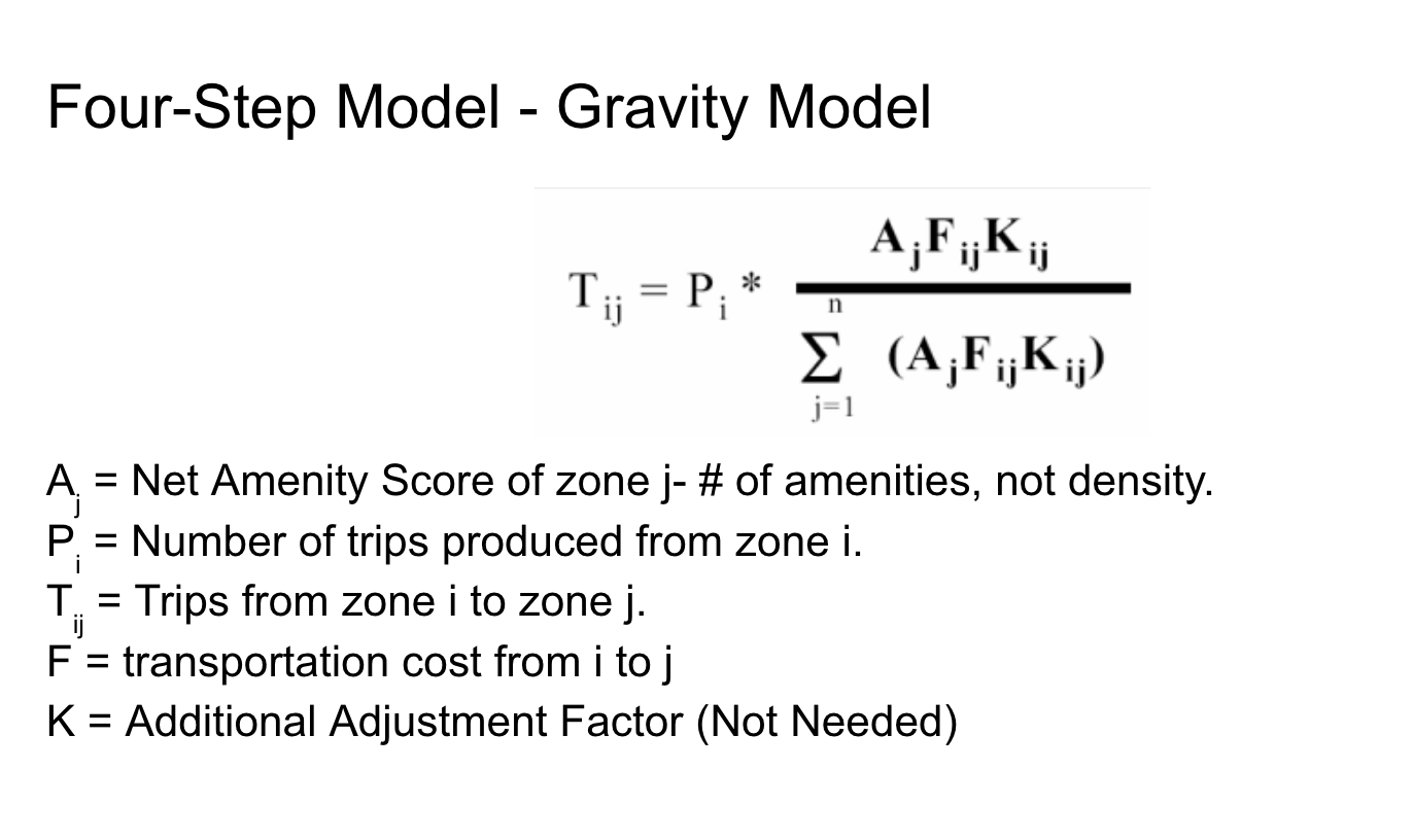 Our approach closely follows these four components. We first generate trips by considering the amenity density of areas. We sum up all amenity densities, and divide each area's density by this sum to generate a probability. We then utilize a Poisson Distribution to generate the number of trips by multipling a base number of trips by the probability. We then consider trip distribution through a modified gravity model. The equation for our model is the following, given that we aim to go from area/region i to j:
