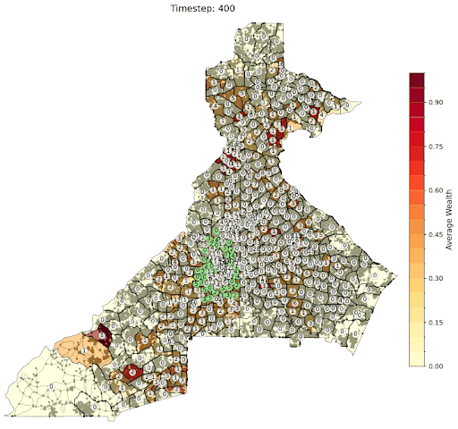 Our code outputs a GIF to visualize agent behavior over time. Each circle represents the centroid of a census tract - green signifying those in the Atlanta Beltline - and the encircled number is the agent population. Our code also outputs a CSV file containing all the simulated data at every individual timestep.