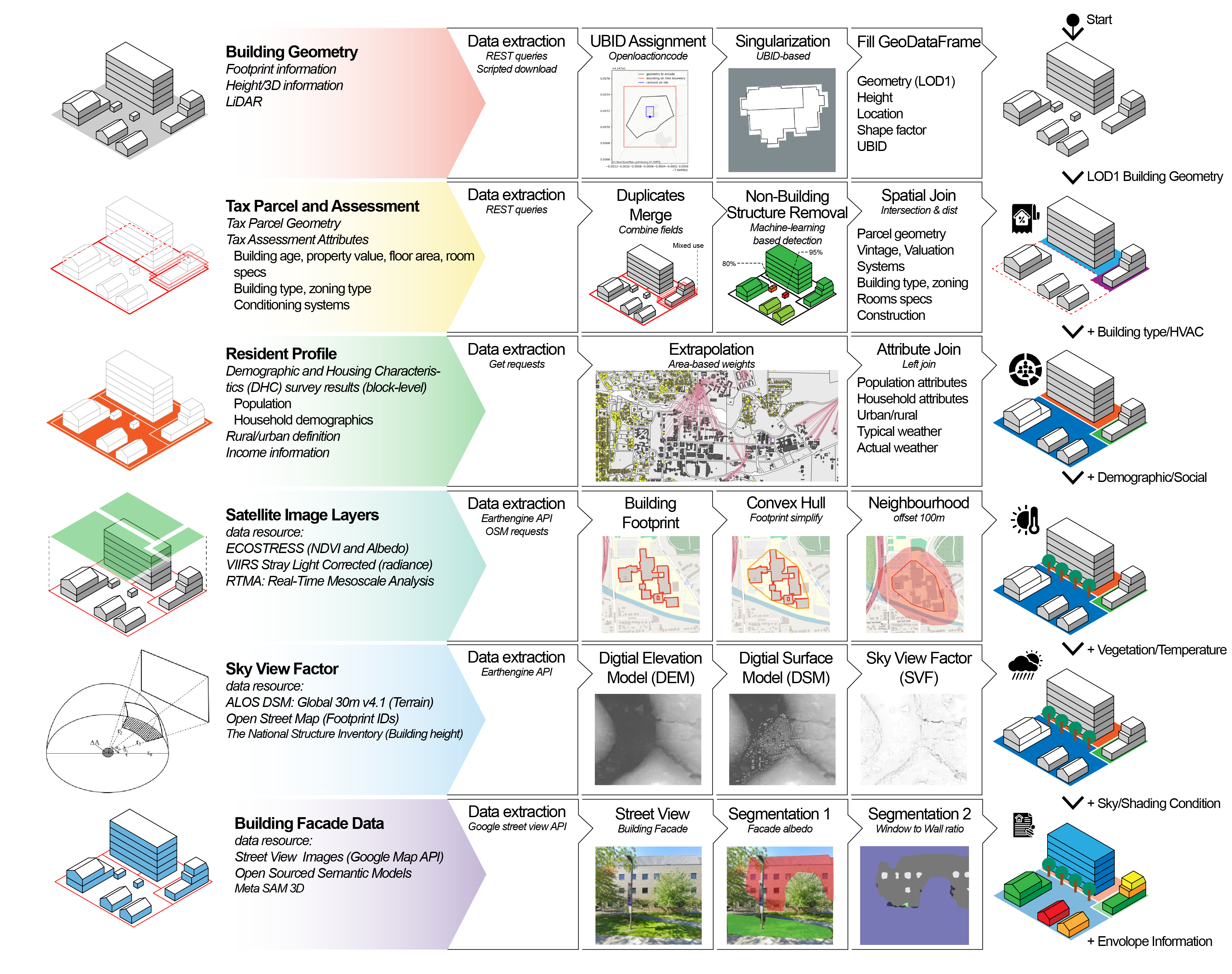 The satellite data acquisition pipeline is adapted and enhanced from the methodological framework proposed in prior New York City studies (Dougherty & Jain, 2023). For each building, local environmental conditions are characterized within a 100 m radius to capture neighborhood-scale microclimatic influences. Specifically, the original building footprint is first simplified using a convex hull algorithm to reduce geometric complexity while preserving its spatial extent. A 100 m radial buffer is then generated around the convex hull to define the final sampling domain for microclimate feature extraction. Satellite-derived environmental variables with native spatial resolutions ranging from 10 m to 2.5 km are processed and resampled within Google Earth Engine to a unified 100 m spatial scale. This resampling strategy ensures spatial consistency across heterogeneous data sources and guarantees that each building-level buffer reliably captures representative pixel-level microclimate information.