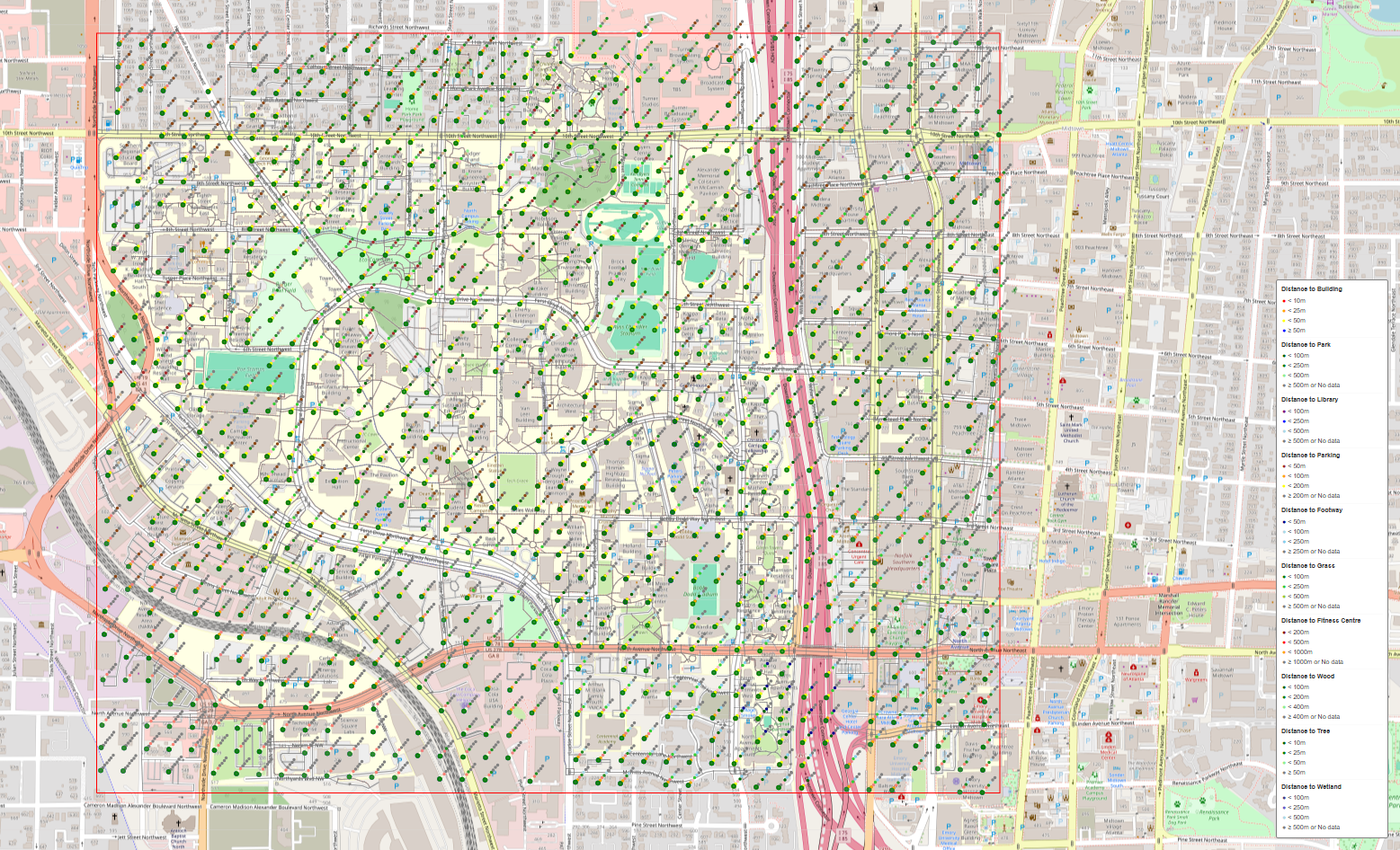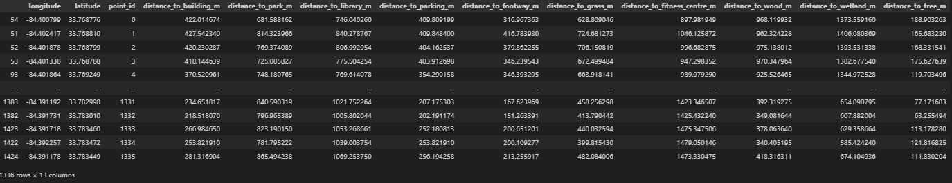 - 12 distance vectors per grid point to features such as buildings, parks, libraries, parking, footways, grass, fitness centers, woods, and wetlands