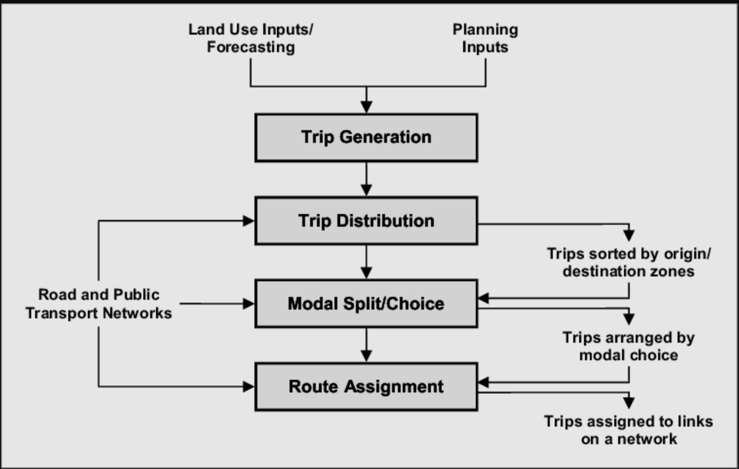 - Mode Choice: This part of the model determines the mode of transporation used to make the trips. This is typically done by considering demographic data (such as the percentage of people with cars) in an area.